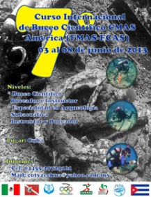 3rd - 8th Jun 2013 ,In Santa María del Mar Playas del Este Cuba, developed the 7th. International Scientific Diving Course CMAS Zone America, in collaboration with UNESCO Havana, Regional Office for Culture in Latin America and the Caribbean, Archaeology Office of the City Historian of Havana, the Mexican Federation of Underwater Activities FMAS and Cuban Federation of Underwater Activities FCAS, with the participation of professionals and researchers specializing in the area of Underwater Archaeology of Mexico and Cuba, from 03 to 08 June