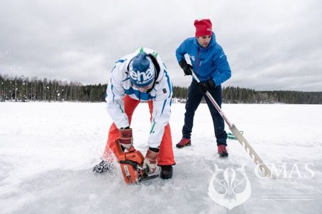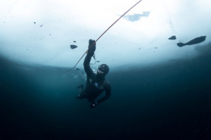 The World Champion Arthur Guérin-Boëri and his team, supported by CMAS and FFESSM, joined Lake Sonnanen in Finland for a Freediving horizontally under Ice record-breaking test set at 175 m. Arthur's monofin lost during the journey did unfortunately not follow the movement but an alternative solution should be quickly found. This mishap has not prevented the champion to get himself into the water for a (very fresh) contact!