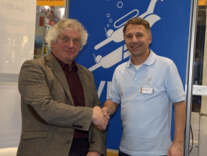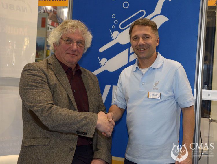 Ralph Schill, CMAS President of the Scientific Committee, met John Geurts from the Nederlandse Onderwatersport Bond (NOB), who is President of the Scientific Committee of CMAS Europe, at the 45th International Boat Show Düsseldorf, Germany.
