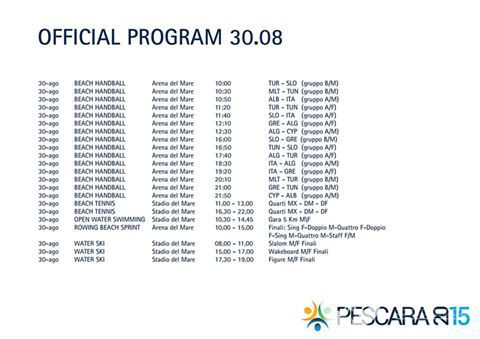 Rowing Beach Sprint awards first medals of the day. In women’s single the Italian Carmela Pappalardo wins the gold medal with 3.24.54 minutes while the French Berra arrives in 3.37.38 minutes (Silver). The Algerian Chiali gains the bronze medal overcoming the Tunisian Boulares.