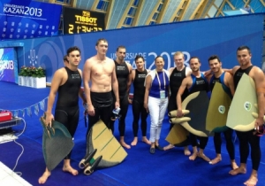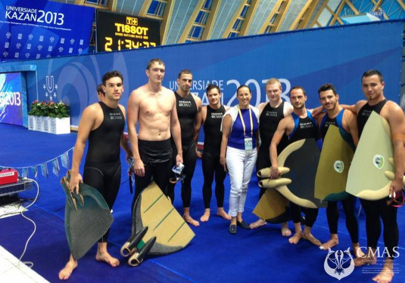 During the last summer Universiade that took place in Kazan (RUS) in July, Finswimming has been represented for the very first time. A team of eight international finswimmers from different countries participated to a 50m surface: Loukas Karetzopoulos and William Baldwin from Greece, Pavel Kabanov and Alexey Kazantsev from Russia, Alexander Drozdov ans Nikolai Tover from Estonia, Giona Cristofari and Stefano Figini from Italy. They offered a great show to the public showing the power, the velocity and the beauty of Finswimming. Three of them swam under 16’’ (Karetzopoulos, 15’’53, Kabanov, 15’’65 and Kazantsev, 15’’79) and four under 17’’ (Drozdov, 16’’25, Baldwin, 16’’26, Cristofari, 16’’50 and Figini, 16’’67). Nikolai Tover closed the results in 17’’07.