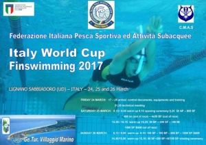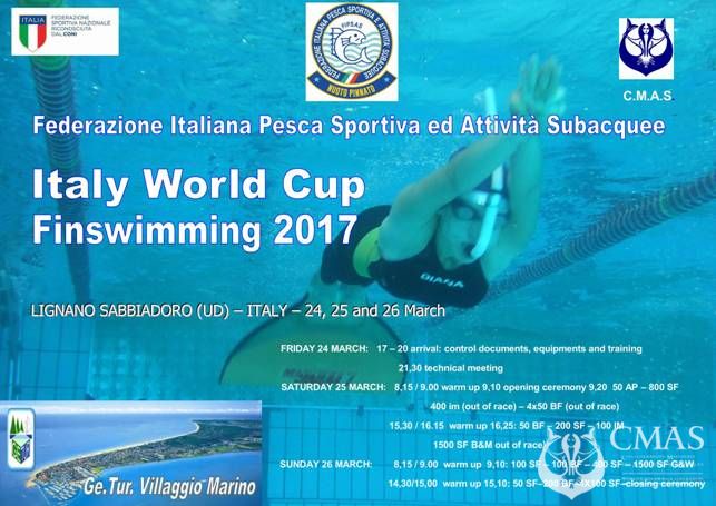 Austria, Belgium, Colombia, Croatia, Czech Republic, Estonia, Finland, France, Germany, Hungary, Italy, Poland, Russia, Slovakia, Switzerland, Tunisia, Turkey, Ukraine, United Kingdom of Great Britain and Northern Ireland is the countries with 88 teams, 428 competitors and 1363 races in 2nd round of world cup in finswimming! The competition will be held in Lignano Sabbiadoro (Italy) from Tomorrow to Sunday 26 of march. we attend you Friday afternoon to take part at this big event, second success for the world cup 2017 for participation level after EGER.